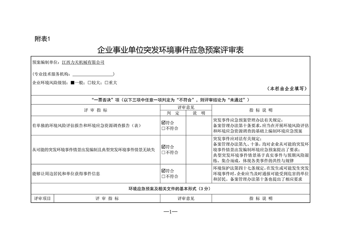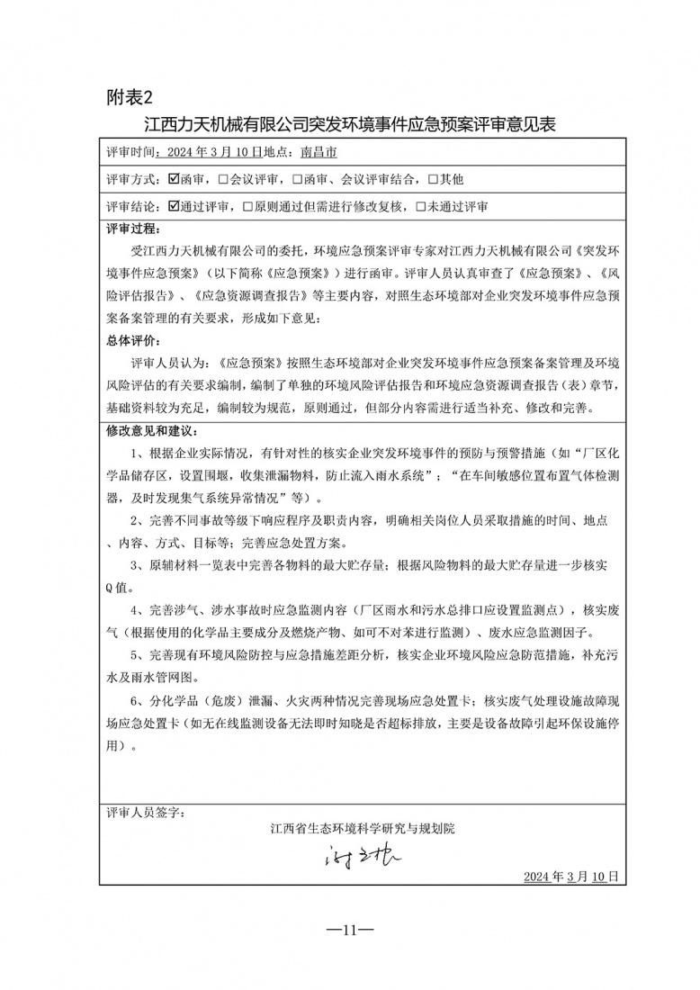 江西力天機械有限公司突發環境事件應急預案評審意見修改說明